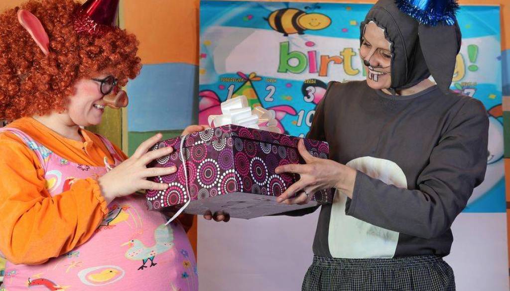 Pujska Vita in zajček Mini pripravljata zabavo ob rojstnem dnevu,