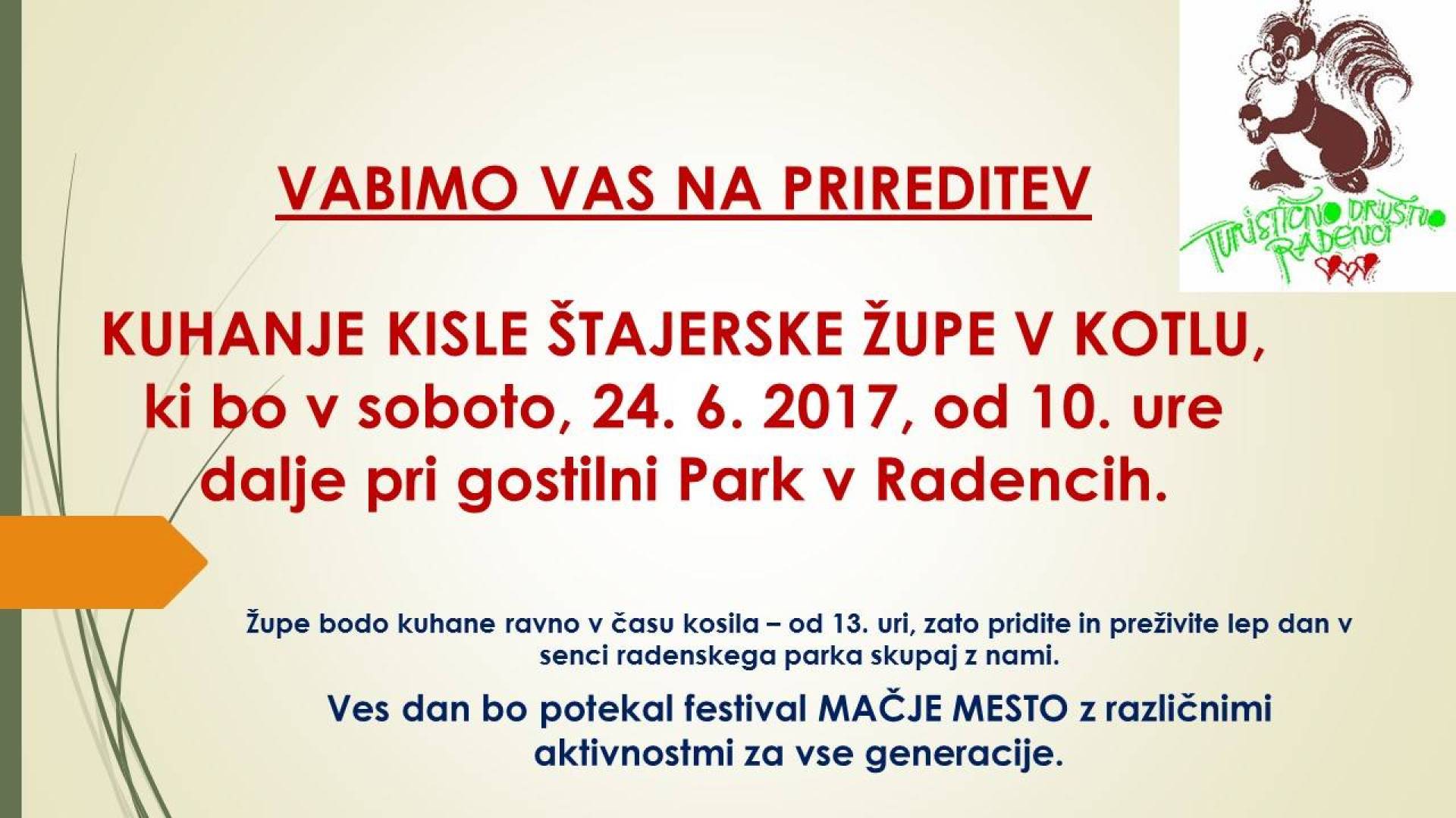 PARK RADENCIVabimo vas na prireditev KUHANJE ŠTAJERSKE KISLE ŽUPE, ki bo v soboto 24.6.2017 s pričetkom ob 10. uri v parku v Radencih (gostilna Park.)