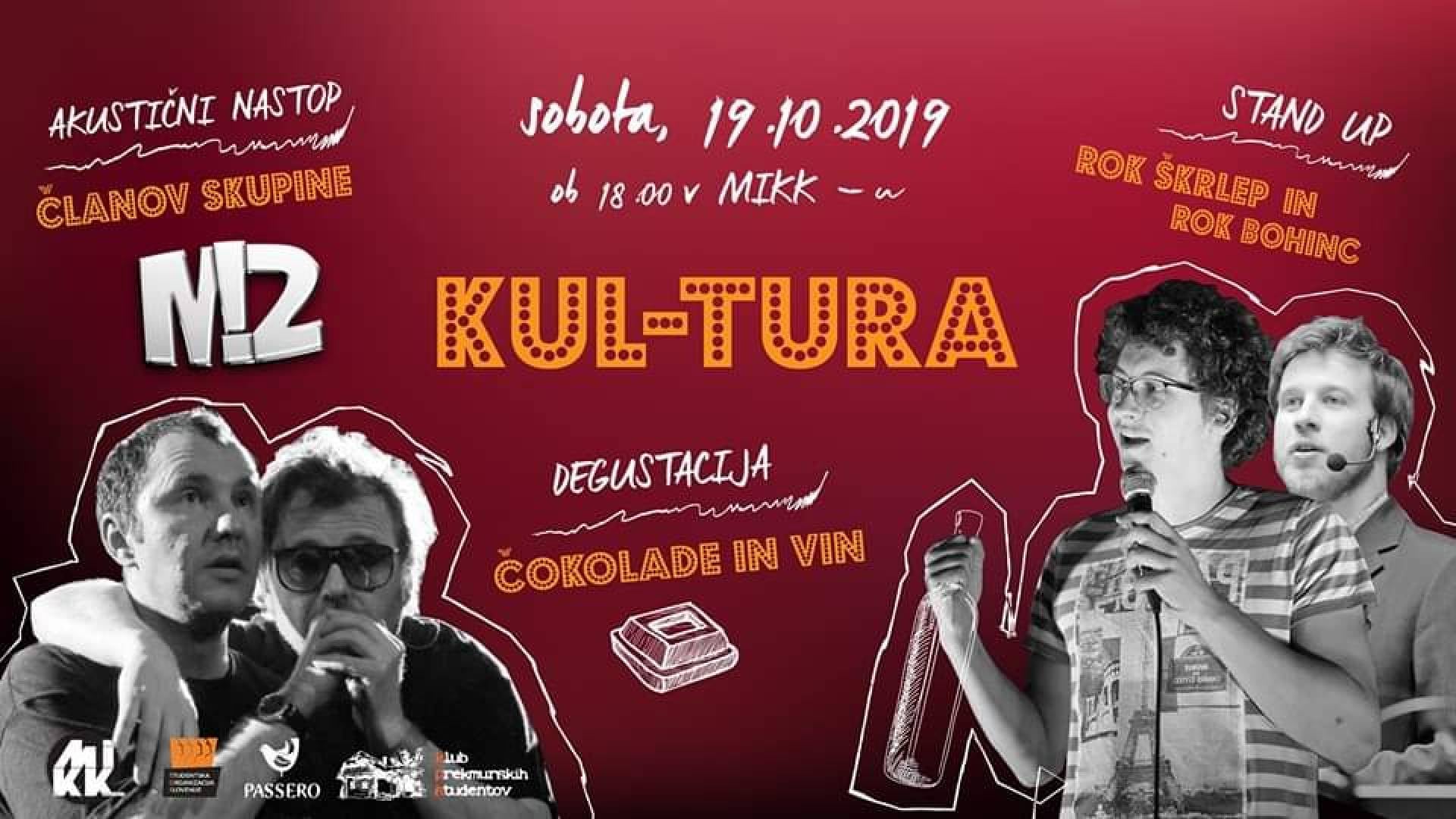 Letošnja KUL-tura se bo odvijala tretjo jesensko soboto, 19. 10. 2019, v prostorih kluba MIKK v Murski Soboti s pričetkom ob 18. uri. Za vas smo ustvarili pester in raznolik program, ki bo sestavljen iz treh sklopov; degustacije čokolad in vina, stand up-a in akustičnega koncerta.