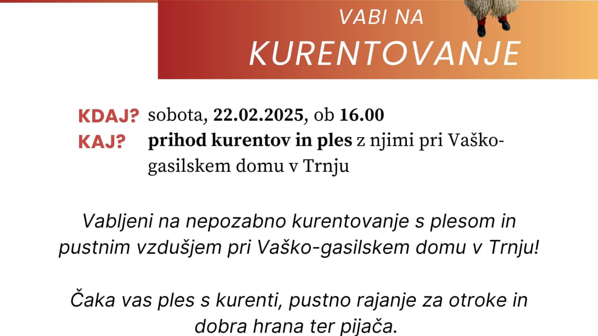 PGD Trnje vabi na rajanje z kurenti, ki bo v soboto 22.2.2025 ob 16.00 uri pri Vaško-gasilskem domu v Trnju.