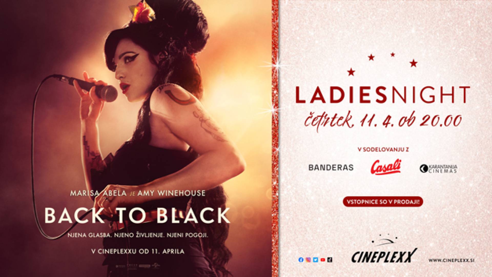 V kinu Cineplexx (Maximus) v Murski SobotiPridruži se nam na Ladies Nightu s filmom BACK TO BLACK, ki bo v četrtek, 11. aprila 2024 ob 20:00 v Cineplexxu Murska Sobota!