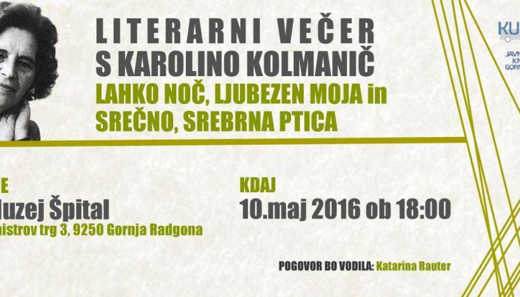 Muzej Špital v Gornji RadgoniPisateljica Karolina Kolmanič bo v literarnem večeru občinstvu predstavila dve knjigi iz svojega bogatega literarnega opusa: roman Lahko noč, ljubezen moja in povest Srečno srebrna ptica.