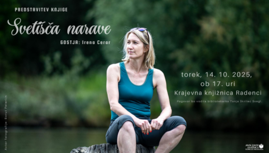 Krajevna knjižnica RadenciVljudno vabljeni v torek, 14. 10. 2025 ob 17. uri v Krajevno knjižnico Radenci (Radgonska c. 9), Radenci), kjer se bo bibliotekarka Tanja Škrilec Švegl pogovarjala z avtorico knjige Svetišča narave.