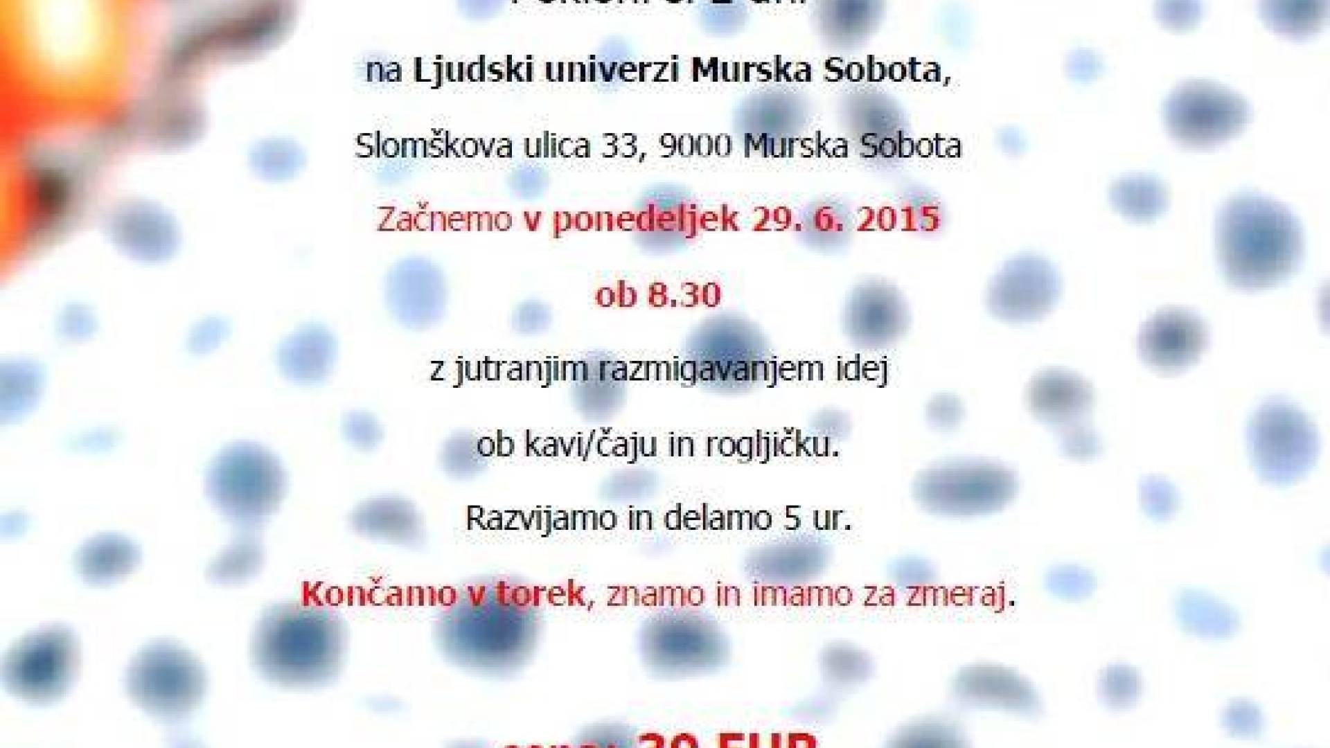 Z delavnico začnemo v ponedeljek 29. 6. 2015 ob 8.30 z jutranjim razmigavanjem idej ob kavi/čaju in rogljičku.