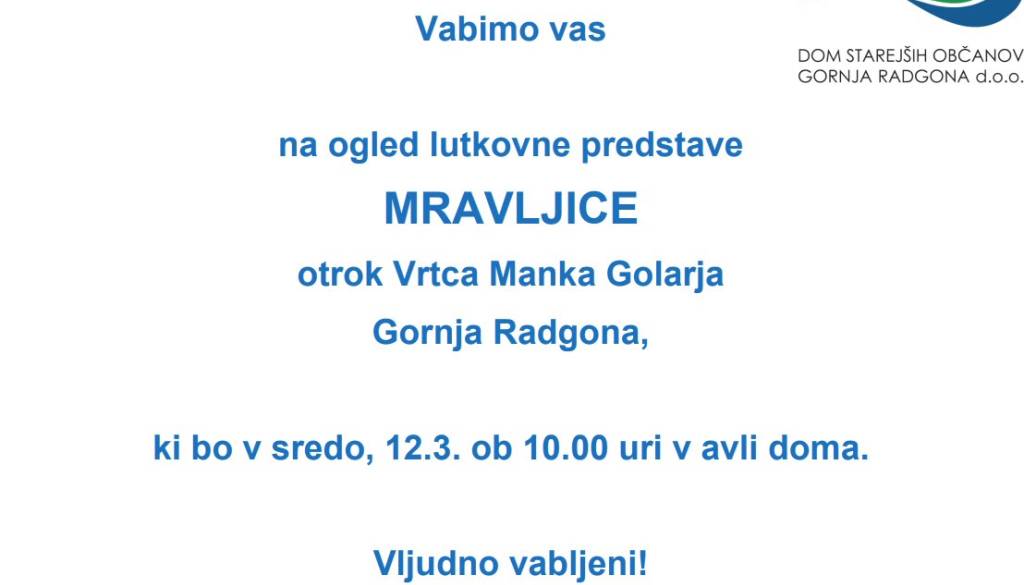 Lutkovna predstava Mravljice gregor1 | 4. marec 2025 12:02 v Za otroke Termin Sreda, 12. marec 2025 10:00 Lokacija Vrtec Manka Golarja Gornja Radgona Lutkovna predstava Mravljice