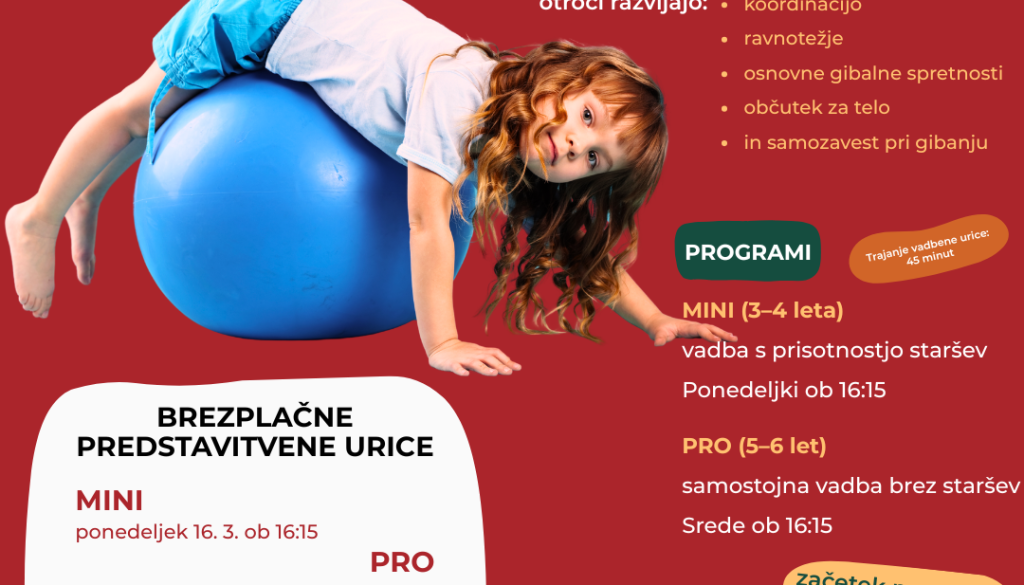 Program poteka v spodbudnem in varnem okolju, kjer otroci skozi gibanje razvijajo koordinacijo, ravnotežje, občutek za telo, osnovne gibalne spretnosti in samozavest pri gibanju.