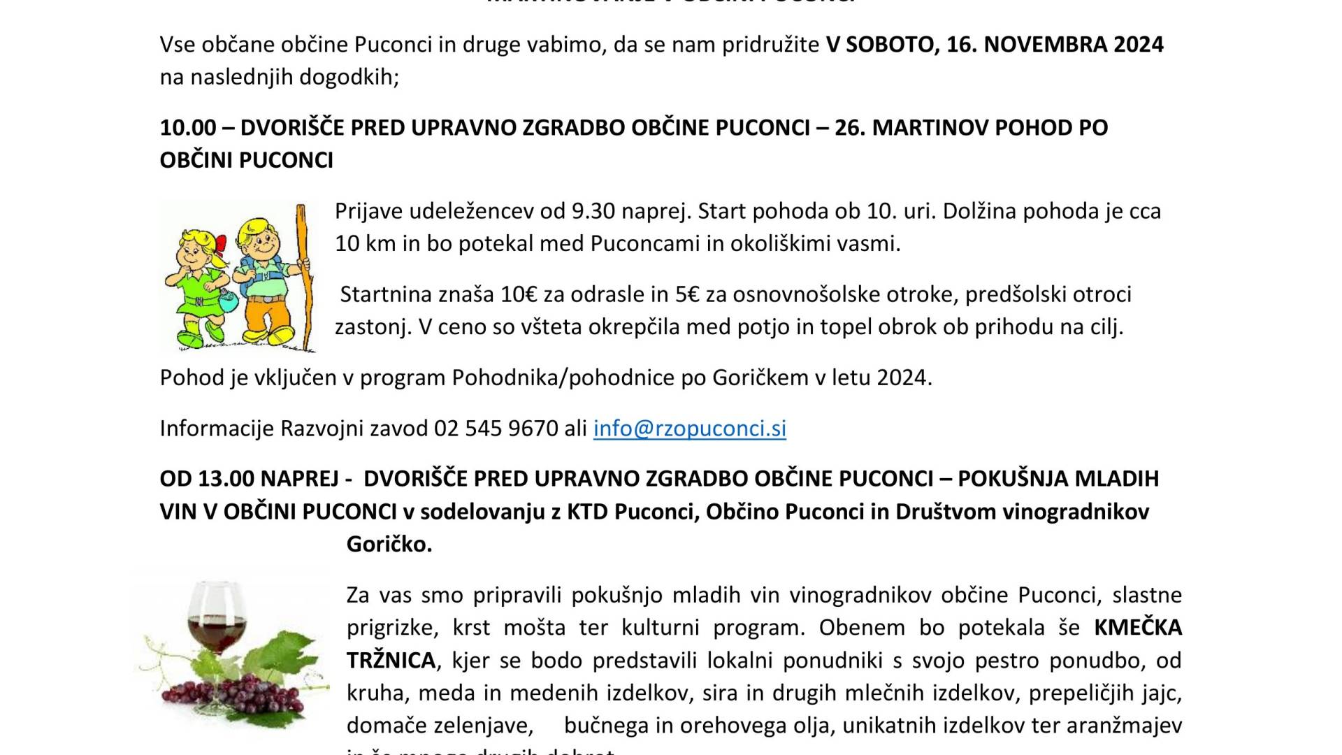 10.00 MARTINOV POHOD PO OBČINI PUCONCI, zbiranje od 9.30 ure naprej, pred občinsko upravno zgradbo. Dolžina pohoda je cca. 10 km, startnina znaša 10 eur za odrasle in 5 eur za osnovnošolske otroke. V ceno so všteta okrepčila med potjo in topel obrok ob prihodu na cilj.