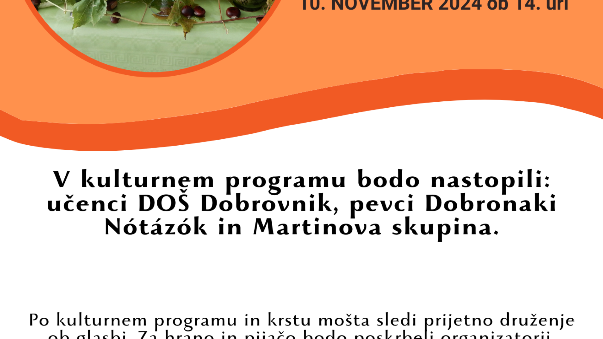 MARTINOVANJE elizabeta | 30. oktober 2024 10:56 v Zabava Termin Nedelja, 10. november 2024 14:00 Lokacija Dobrovnik - kulturni dom Vabljeni na prijetno druženje!