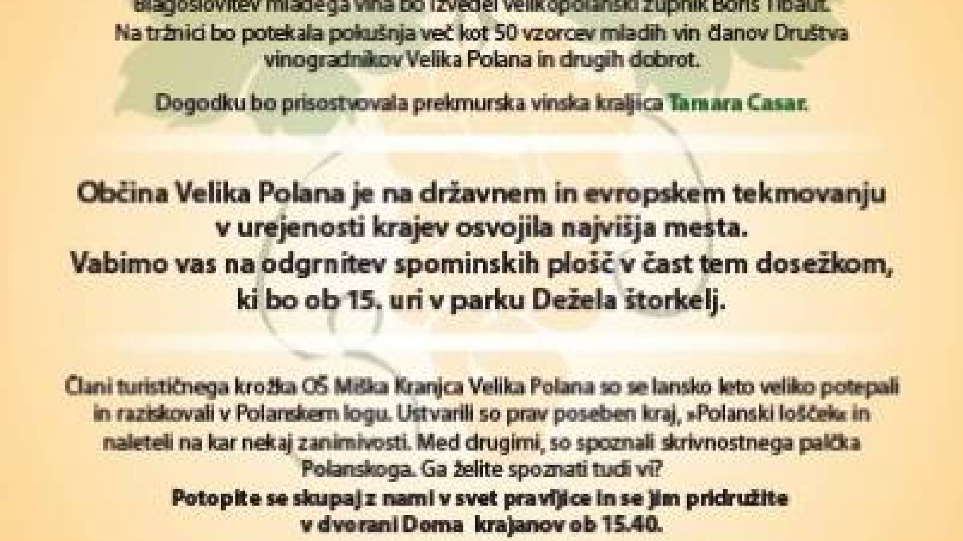 Blagoslovitev mladega vina bo izvedel naš velikopolanski župnik,  za tem pa se boste lahko sprehodili po tržnici in poizkusili več kot 50 vzorcev mladih vin članov Društva vinogradnikov Velika Polana.