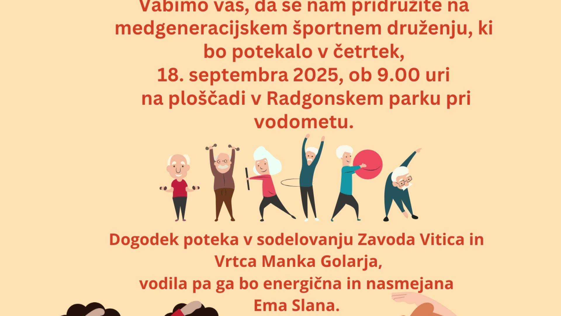 v Mestnem parku Gornja RadgonaV četrtek, 18. septembra 2025, ob 9. uri Zavod Vitica vabi vse ljubitelje gibanja. da se jim pridružimo na medgeneracijskem športnem druženju na ploščadi v Mestnem parku Gornja Radgona. Več informacij na plakatu.