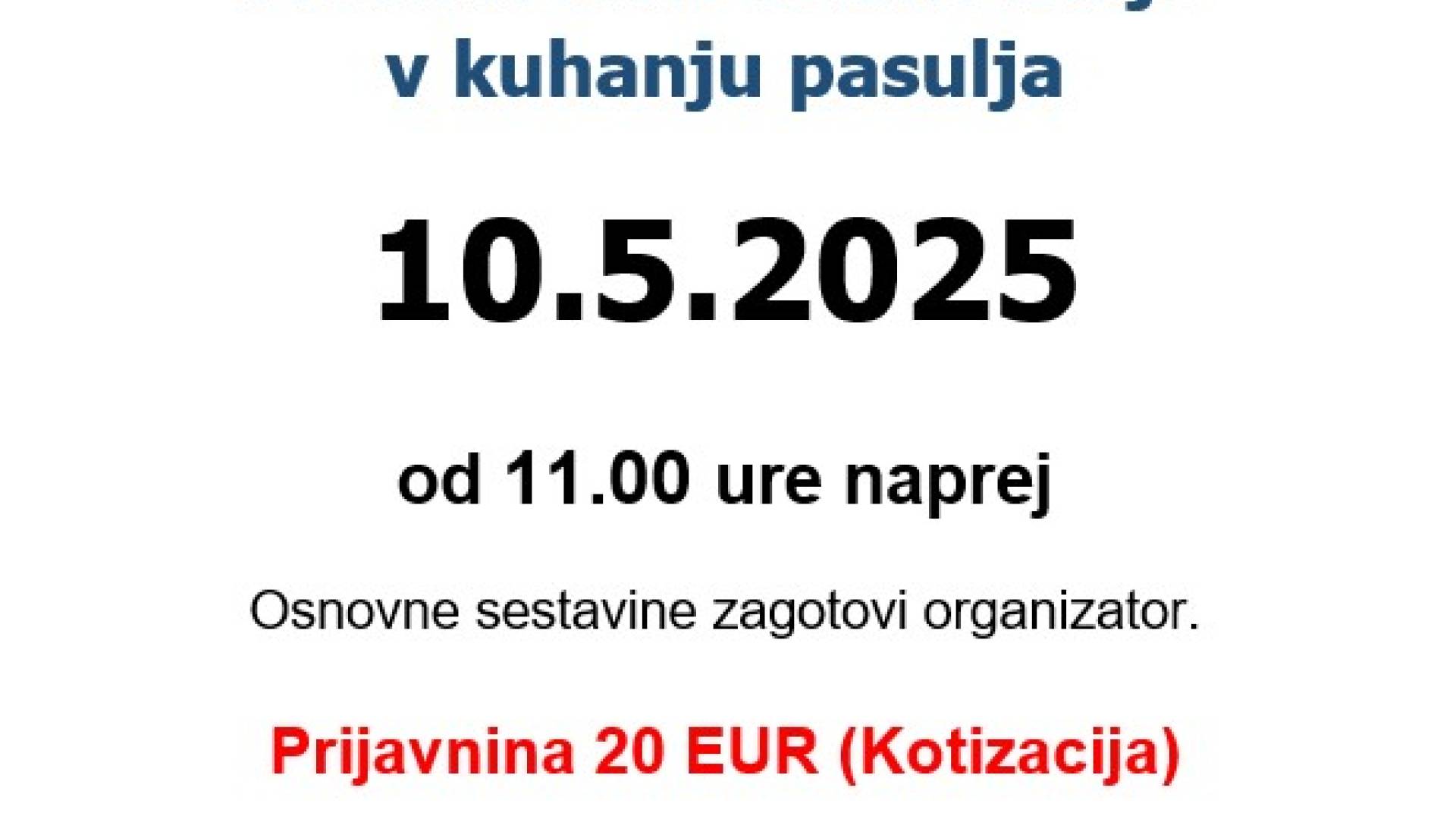 Mednarodna pasuljada gregor1 | 5. maj 2025 08:19 v Ostalo Termin Sobota, 10. maj 2025 11:00 Lokacija PGD Radmožanci Kdor najboljše skuha, bo zmagal!!!!