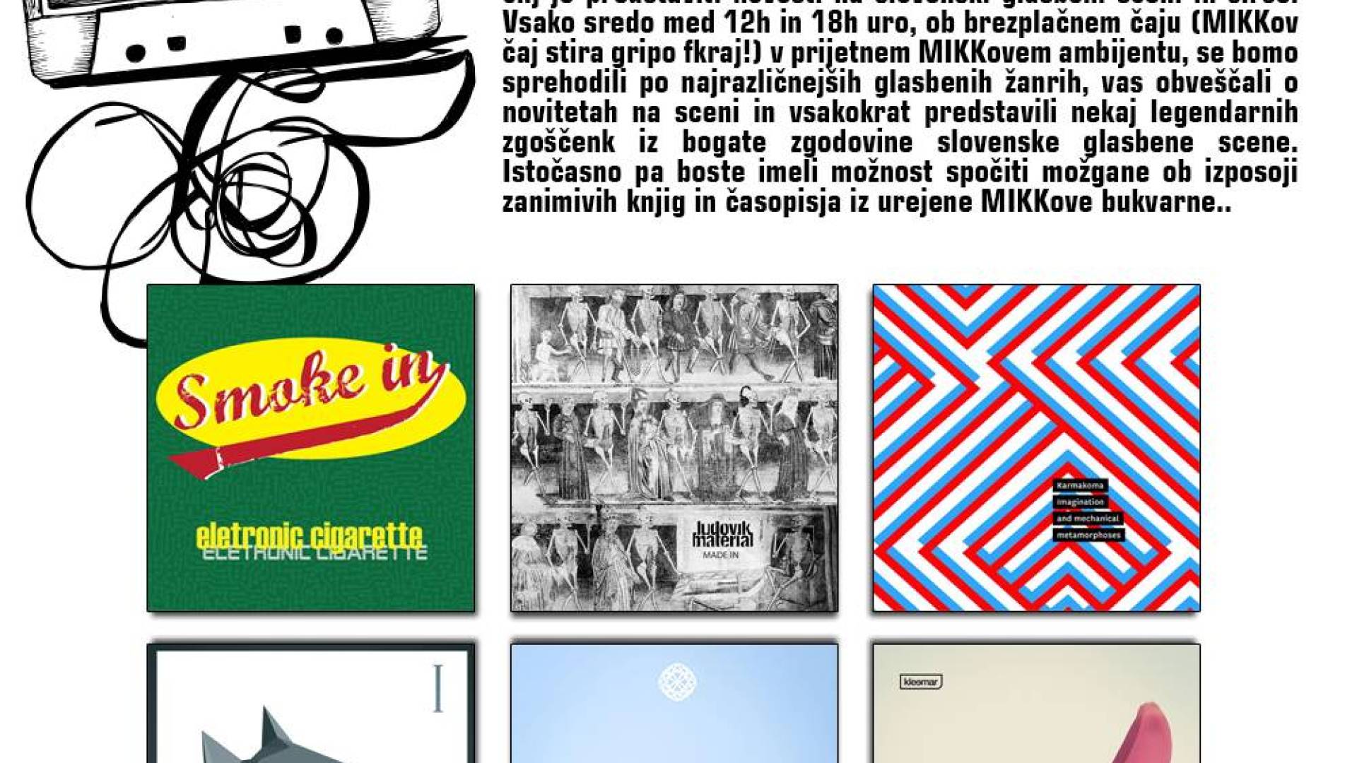 Vsako sredo med 12h in 18h uro, ob brezplačnem čaju (MIKKov čaj stira gripo fkraj!) v prijetnem MIKKovem ambijentu, se bomo sprehodili po najrazličnejših glasbenih žanrih, vas obveščali o novitetah na sceni in vsakokrat predstavili nekaj legendarnih zgoščenk iz bogate zgodovine slovenske glasbene scene.