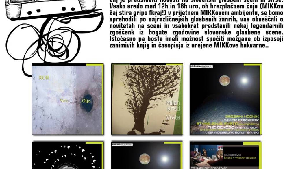 MIKK Murska Sobota»MIKKov Kultivator« je ime nove dnevne poslušalnice, katere cilj je predstaviti novosti na slovenski glasbeni sceni in širše. Vsako sredo med 12h in 18h uro, ob brezplačnem čaju (MIKKov čaj stira gripo fkraj!) v prijetnem MIKKovem ambijentu, se bomo sprehodili po najrazličnejših glasbenih žanrih, vas obveščali o novitetah na sceni in vsakokrat predstavili nekaj legendarnih zgoščenk iz bogate zgodovine slovenske glasbene scene. Istočasno boste imeli priložnost spočiti možgane ob izposoji zanimivih knjig in časopisja iz urejene MIKKove bukvarne...