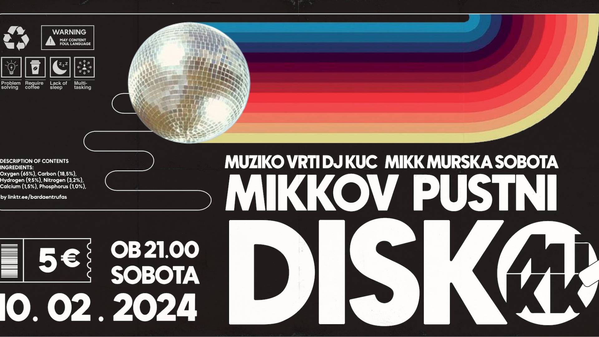 Tradicionalni MIKKov disko, odlična plesna glasba in klubska atmosfera, najbolj nore in neverjetne maske ter druženje z ljudmi, ki jih že nekaj časa niste srečali. Verjetno jih tokrat ne boste nekaj časa niti prepoznali, ker bodo vsi tako ali tako zamaskirani.