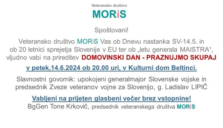 Veteransko društvo MORIS vas ob dnevu nastanka SV–14.5 in 20. obletnici sprejetja Slovenije v EU ter ob »letu generala MAISTRA« vljudno vabi na prireditev ...