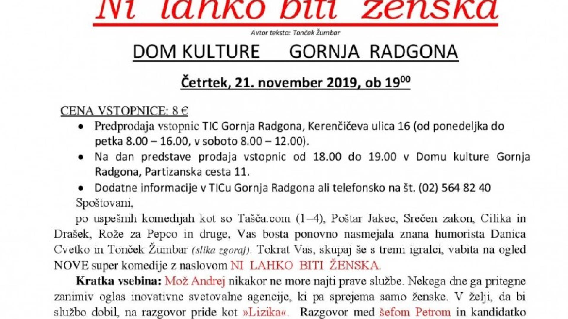 Dom kulture Gornja RadgonaPo uspešnih komedijah kot so Tašča.com, Poštar Jakec, Srečen zakon, Cilika in Drašek, Rože za Pepco in druge, vas bodo z novo komedijo, Ni lahko biti ženska, ponovno nasmejali člani KUD Veseli oder. Predstava bo v Domu kulture Gornja Radgona na sporedu v četrtek, 21. 11. 2019, ob 19. uri. Vstopnice pa so že na voljo v vašem TIC Gornja Radgona.