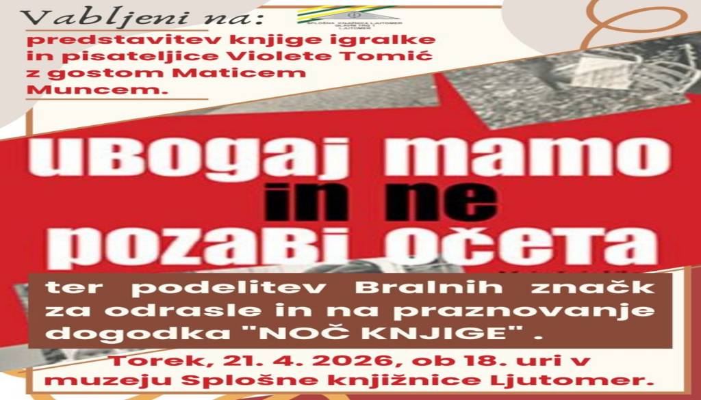 Splošna knjižnica LjutomerVabljeni na predstavitev knjige Violete Tomić, ki bo v torek, 21. 4. 2026, ob 18. uri v muzeju Splošne knjižnice Ljutomer.