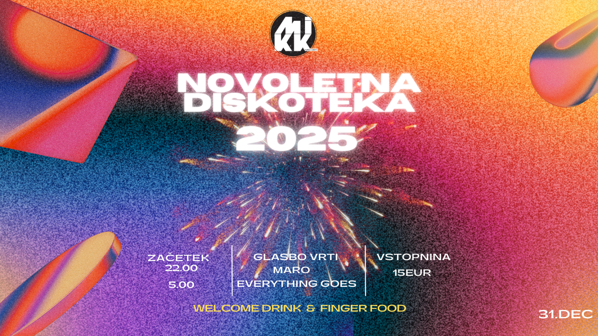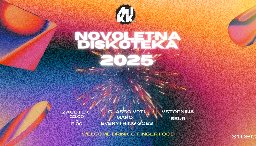 🎉🪩Novo leto ne rabi veliko – le dobro glasbo, še boljšo družbo in energijo, ki traja do zore. Vse to te čaka na MIKK-ovi novoletni diskoteki!