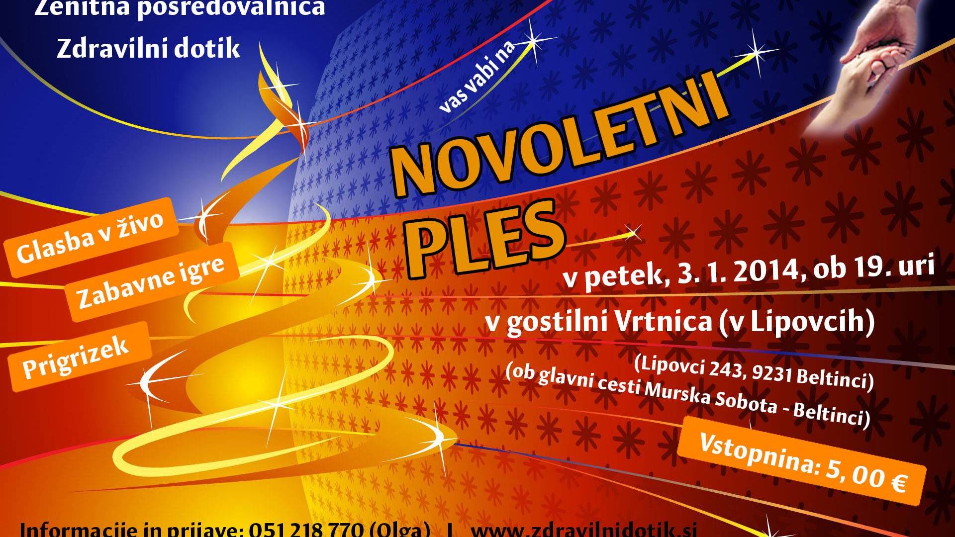 Gostilna Vrtnica LipovciŽenitna posredovalnica Zdravilni dotik vabi na Novoletni ples za samske, ki bo v petek, 3. 1. 2014 ob 19. uri, v gostilni Vrtnica v Lipovcih. Pridružite se nam v prvem novoletnem plesu, s katerim bomo vstopili v leto 2014.