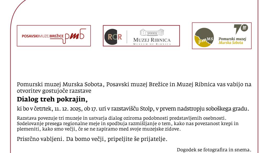 Pomurski muzej Murska SobotaPomurski muzej Murska Sobota, Posavski muzej Brežice in Muzej Ribnica vas vabijo na otvoritev gostujoče razstave Dialog treh pokrajin.