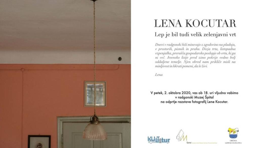 Muzej Špital v Gornji RadgoniV petek, 2. oktobra 2020, vas ob 18. uri vljudno vabimo v Muzej Špital na odprtje razstave fotografij Lene Kocutar. Rodbinska hiša je dajala prostor stalnega ali občasnega prebivanja številnim generacijam Simoničevih in Šlebingerjevih potomcev. Tudi Šlebingerjevi prapravnukinji Leni Kocutar, ki se je s kamero približala njeni današnji podobi.