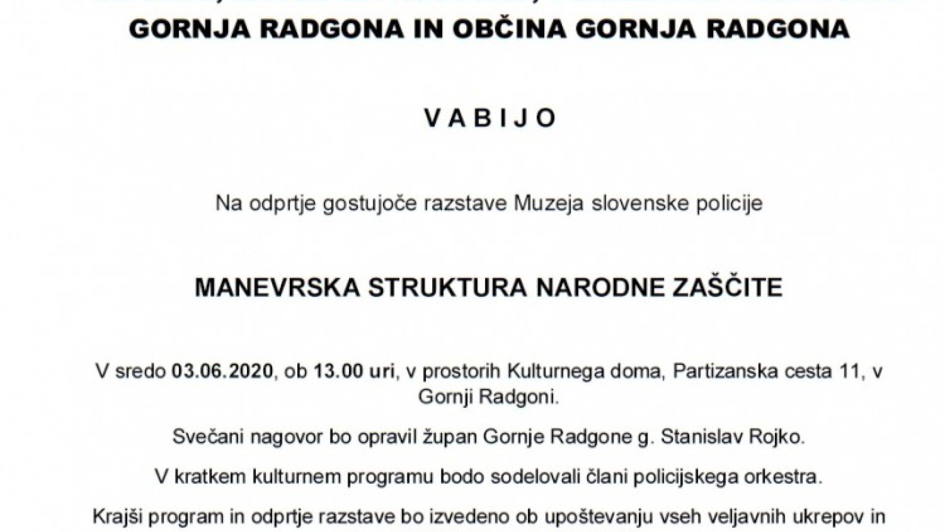 V imenu Policijskega veteranskega društva SEVER za Pomurje, Zavoda Kultprotur in Občine Gornja Radgona vas v sredo, 3. junija 2020, ob 13. uri prijazno vabimo na odprtje gostujoče razstave Muzeja slovenske policije Manevrska struktura narodne zaščite.