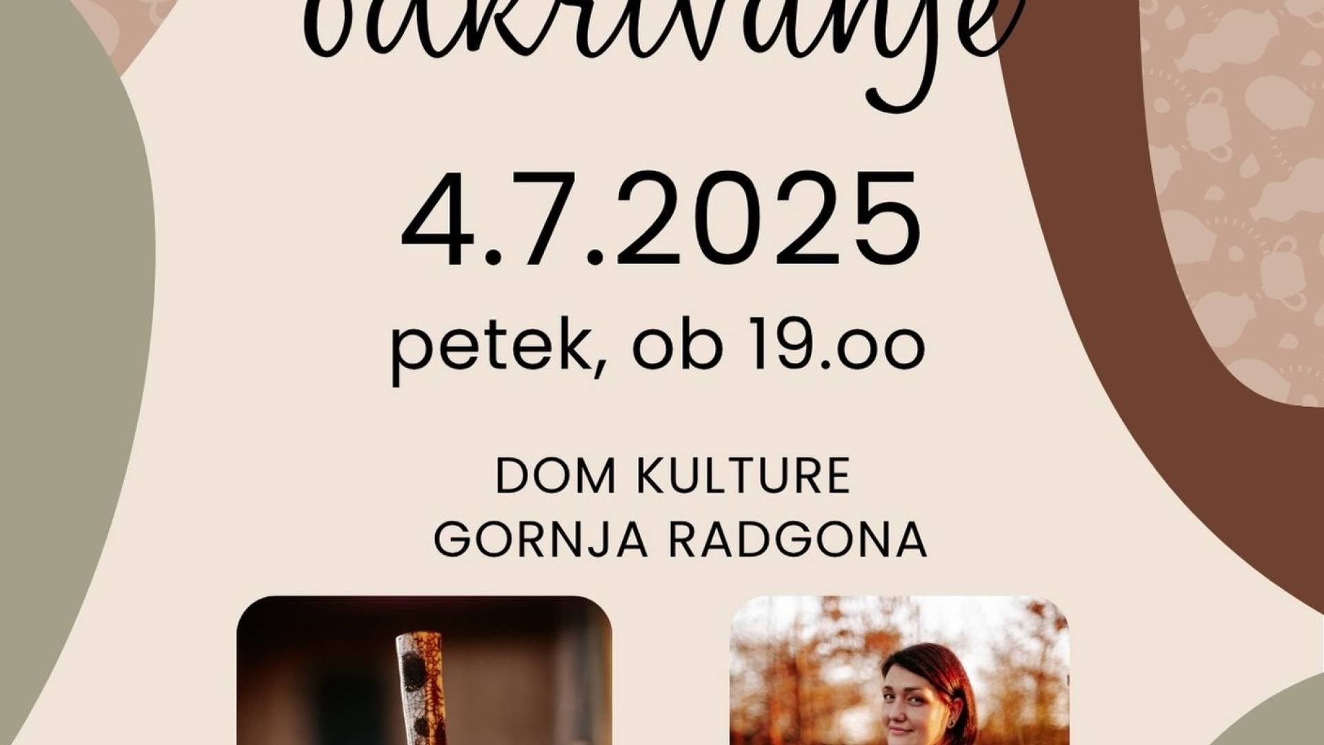 Galerija Doma kulture Gornja RadgonaV petek, 4. julija 2025, ob 19. uri v galerijo Doma kulture Gornja Radgona odpiramo samostojno razstavo keramike Renate Ošlaj, Odkrivanje. Vabljeni, da skupaj odkrijemo zgodbe, ujete v glino.