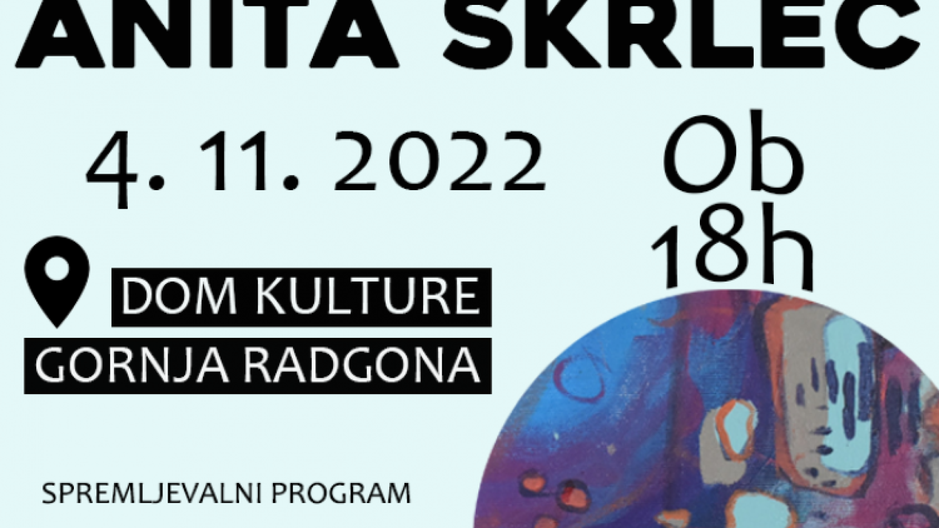 Dom kulture Gornja RadgonaPrijazno vabljeni na odprtje samostojne razstave Anite Škrlec, ki bo v galeriji Doma kulture Gornja Radgona v petek, 4. novembra 2022, ob 18. uri. Za spremljevalni program bosta poskrbela Simon Škrlec - Drummer in Sara Kager.