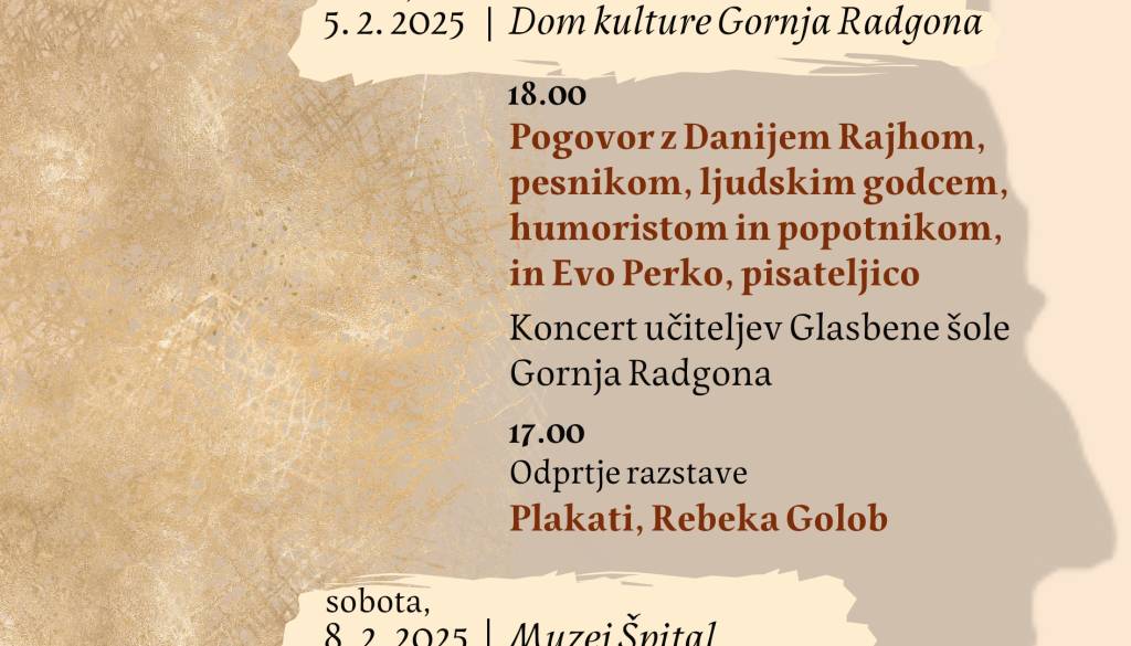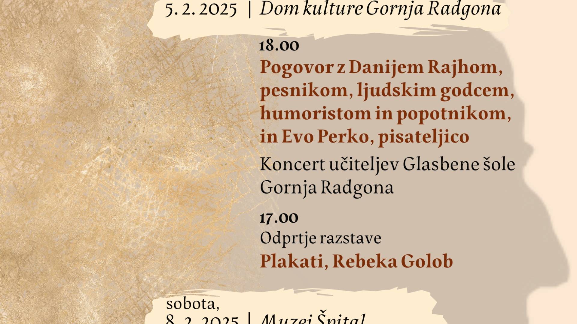 Ob 18. uri pa – v dvorani Doma kulture – sledi pogovor z Danijem Rajhom, pesnikom, ljudskim godcem, humoristom in popotnikom, in Evo Perko, pisateljico ki ga bo okronal koncert učiteljev Glasbene šole Gornja Radgona.