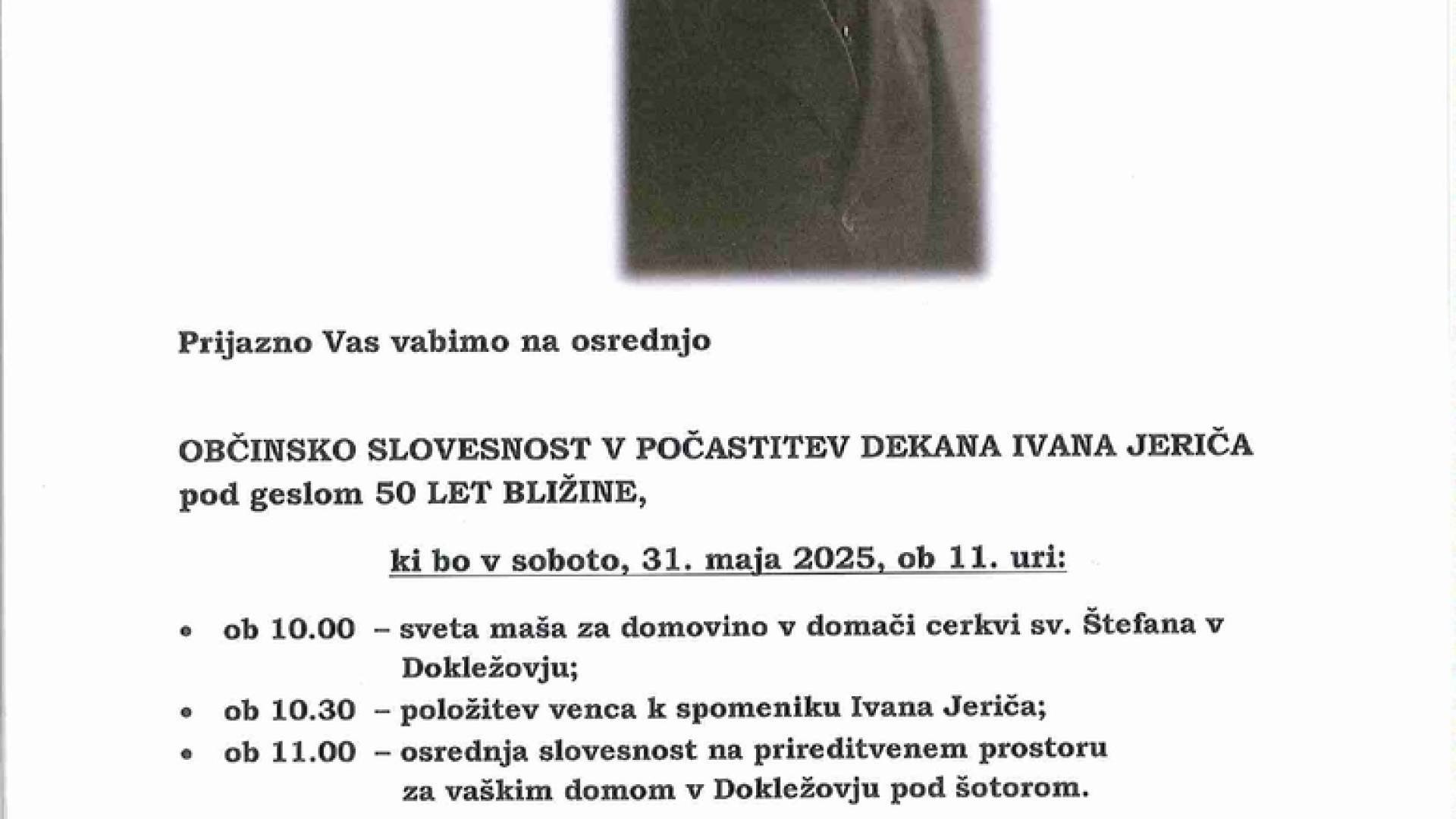 DokležovjePrisrčno vabljeni, da se skupaj poklonimo narodnemu buditelju, generalnemu vikarju za Prekmurje ter pokončnemu rodoljubu Ivanu Jeriču!