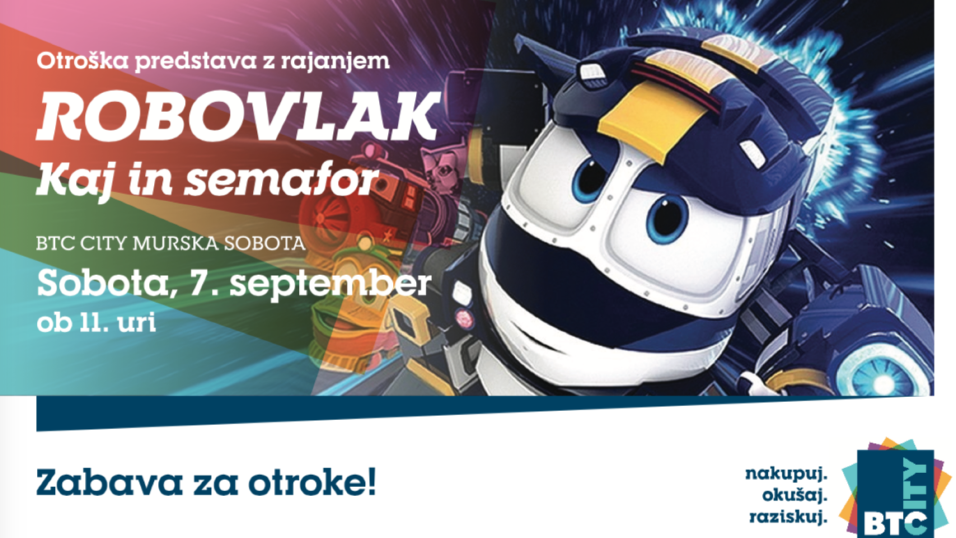 BTC City Murska SobotaOtroci vabljeni v BTC CITY MURSKA SOBOTA v sobota, 7.9.2019 ob 11.uri na otroško predstavo z rajanjem, ROBOVLAK Kaj in semafor.