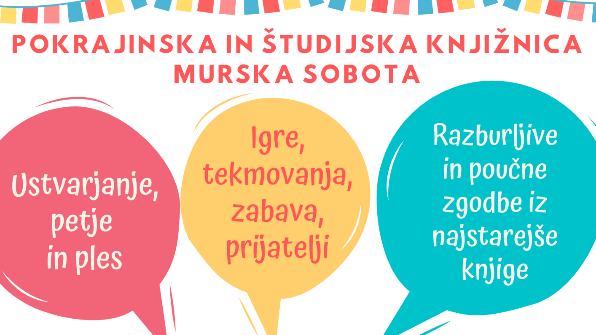 Pokrajinska in študijska knjižnica Murska Sobota Zvezna ulica 10 9000 Murska SobotaPridružite se nam v Pokrajinski in študijski knjižnici Murska Sobota vsak ponedeljek od 16.00 do 17.00 in prisluhnite zanimivi zgodbi, ustvarjajte, plešite, pojte in se zabavajte z nami. Dejavnost je namenjena otrokom, starim od 5 do 12 let in je brezplačna.