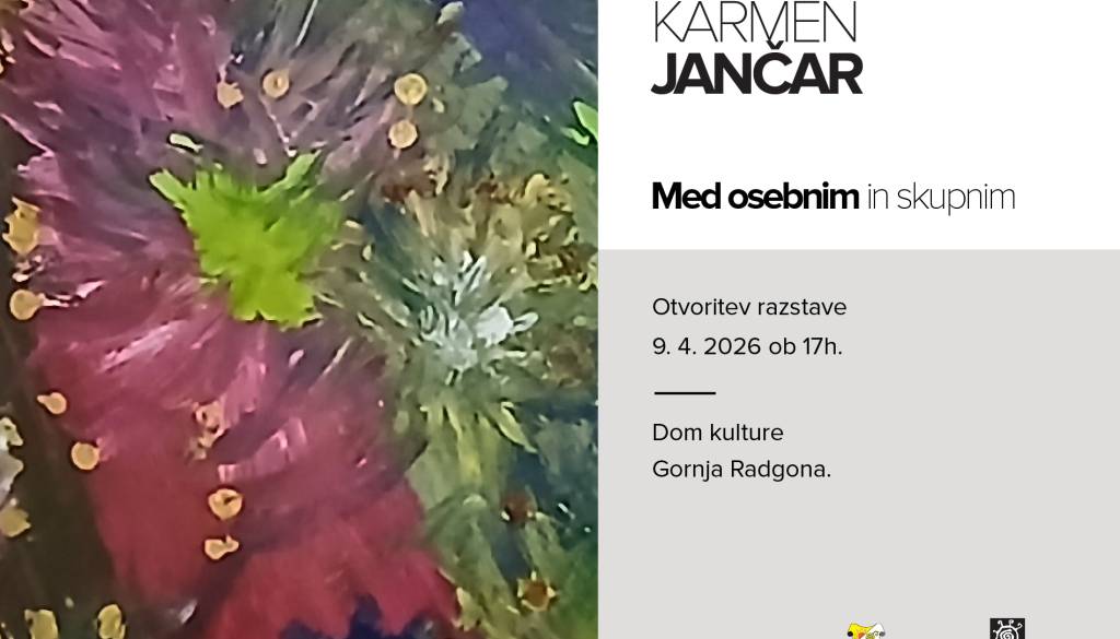 Dom kulture Gornja RadgonaPrijazno vabljeni na otvoritev razstave Karmen Jančar, Med osebnim in skupnim, ki bo v galeriji Doma kulture Gornja Radgona v četrtek, 9. aprila 2026, ob 17. uri.