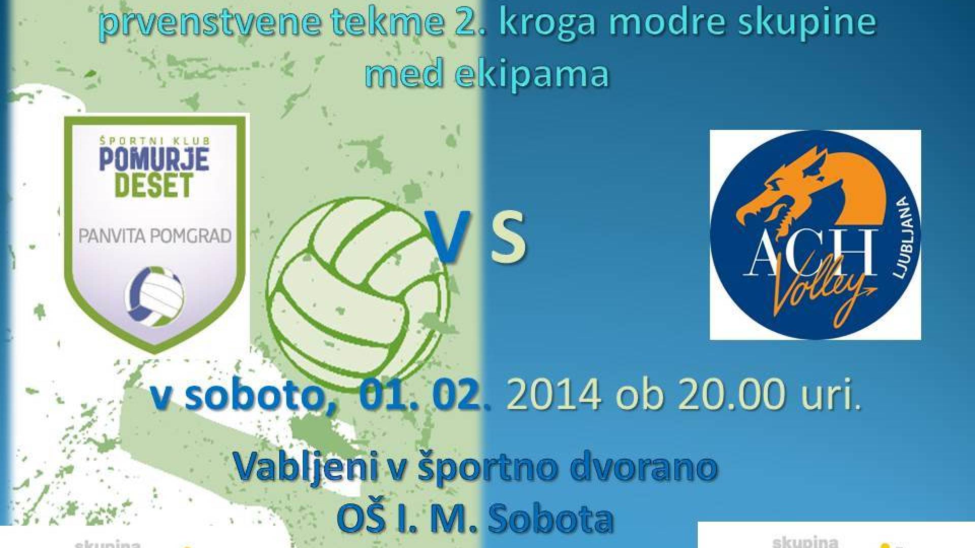 Športna dvorana OŠ I. M. SobotaLjubitelji odbojke, v Murski Soboti se nam v soboto,01.02.2014 ob 20. uri obeta pravi spektakel! Panvita Pomgrad se bo namreč pomerila proti ACH-ju, najboljši slovenski ekipi zadnjih let. Kljub temu, da vloga favoritov pripada gostov, se domači odbojkarji ne predajajo!