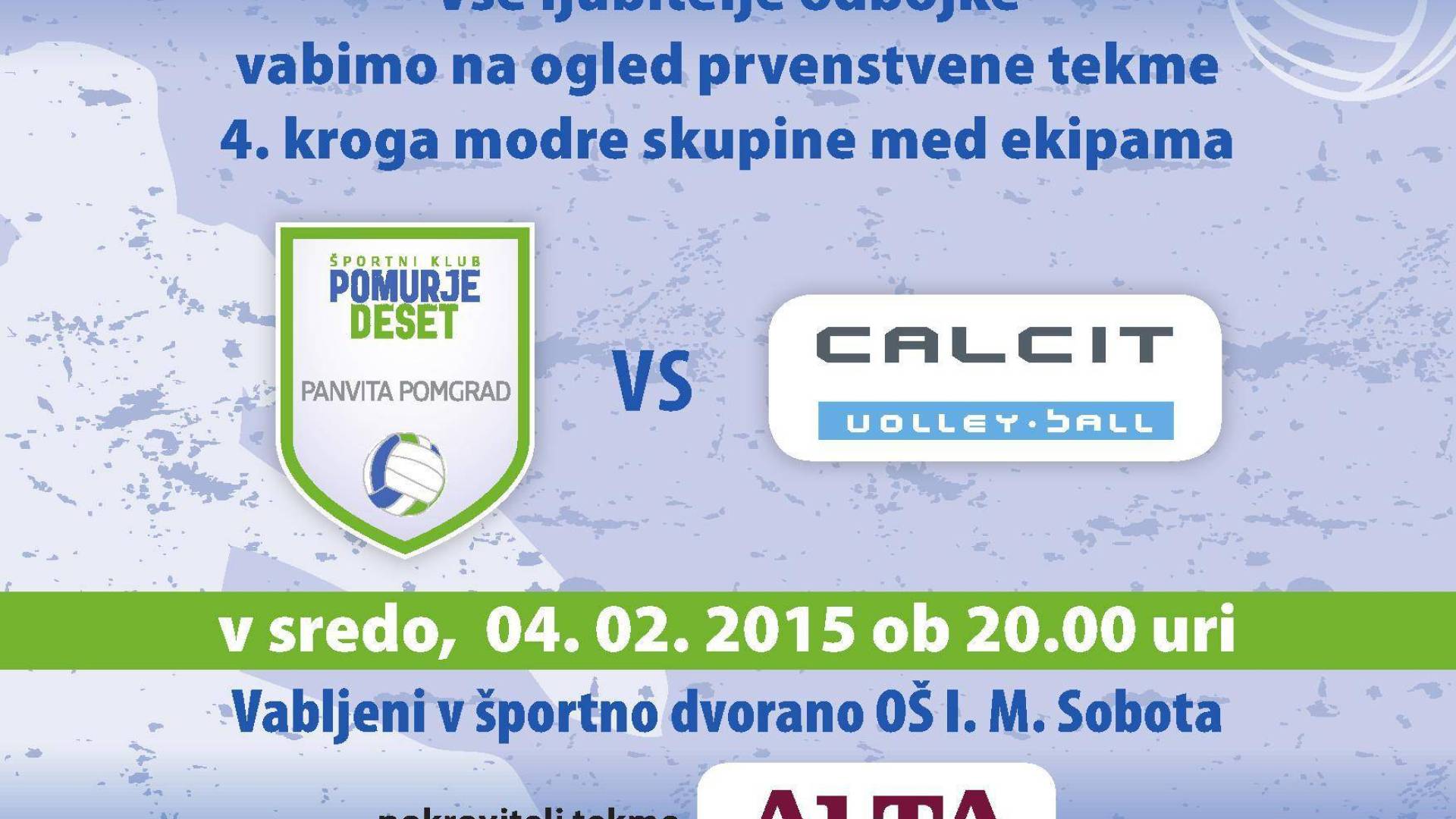 Športna dvorana OŠ I Murska SobotaLjubitelji in ljubiteljice odbojke, pozor. Neizprosen ritem modre skupine se nadaljuje in za Panvito Pomgrad ni počitka. Soboški odbojkarji se bodo v sredo, 04.02.2015 ob 20. uri v športni dvorani I. osnovne šole pomerili s Calcitom in obeta se nam nova odbojkarska poslastica. Navijači pridite na tekmo in z glasnim navijanjem pomagajte Panviti Pomgrad do zmage. Se vidimo v sredo ob 20. uri.