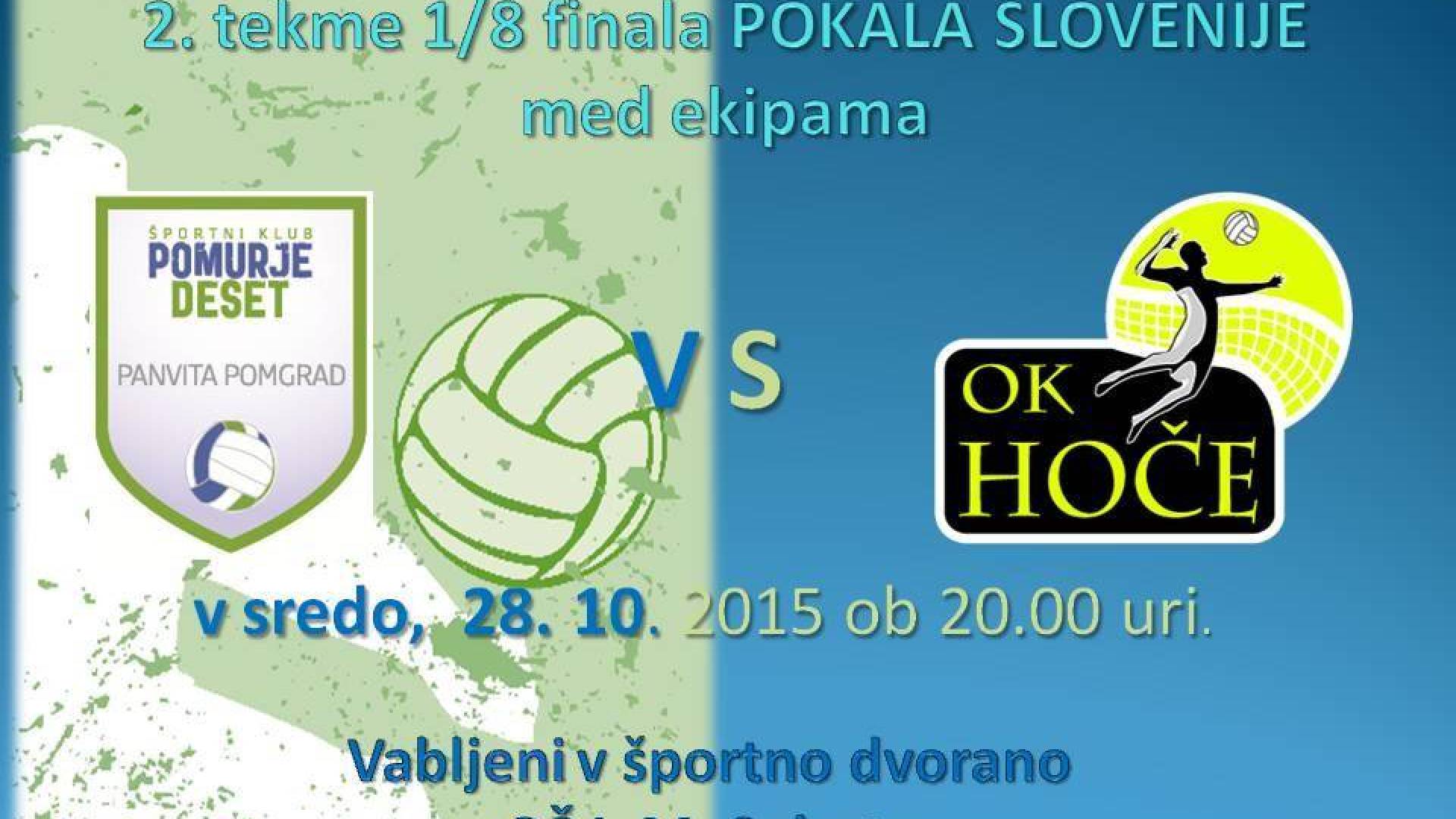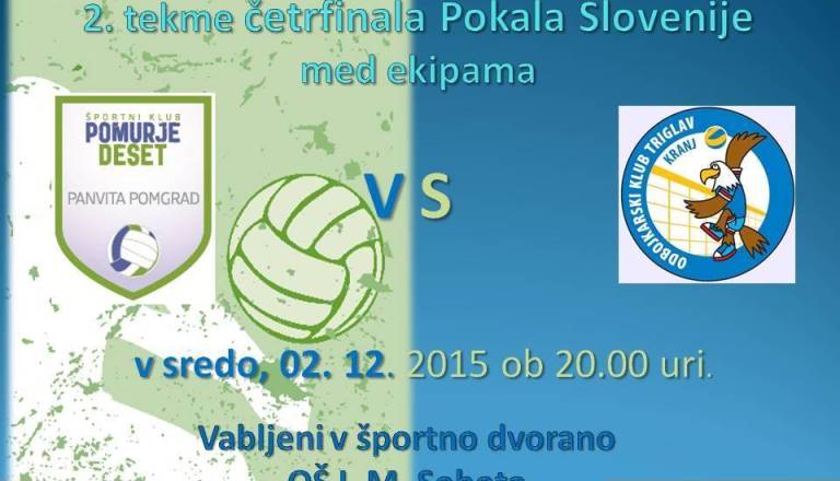 Športna dvorana OŠ I. M. SobotaOdbojkarji Panvite Pomgrada odpirajo drugo fronto. Tako jih v drugi tekmi osmine finala Pokala Slovenije čaka dvoboj z Hočami. Na prvi tekmi so naši odbojkarji slavili z rezultatom 3:0.
