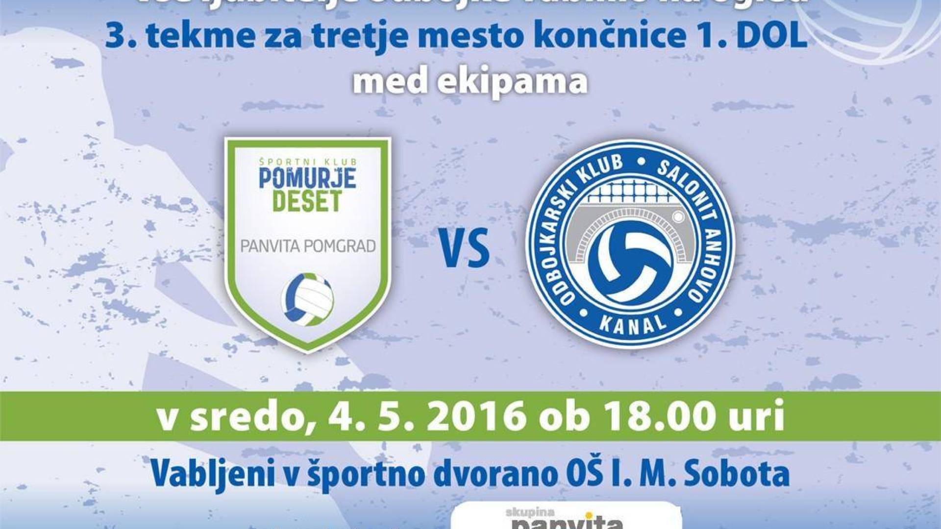 Tekma med Panvito Pomgrad in Salonit Anhovo se bo v športni dvorani I. osnovne šole Murska Sobota začela v sredo, 04. 05. 2016 ob 18. uri.