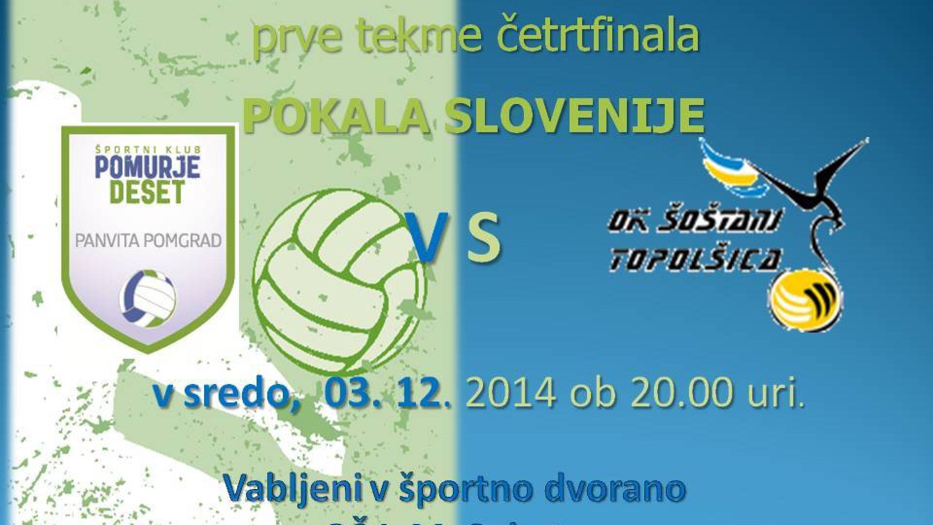 Športna dvorana OŠ I Murska SobotaPanvita Pomgrad se bori za vstopnico med najboljše štiri ekipe v pokalnem tekmovanju. Soboške odbojkarje čaka v sredo, 03. decembra prva četrtfinalna tekma proti Šoštanj Topošica. Tekma v športni dvorani I. osnovne šole Murska Sobota se bo pričela ob 20. uri. Odbojkarji bodo potrebovali vašo pomoč, zato pridite navijat za Panvito Pomgrad in jih ponesite do zmage! Gremo Panvita Pomgrad