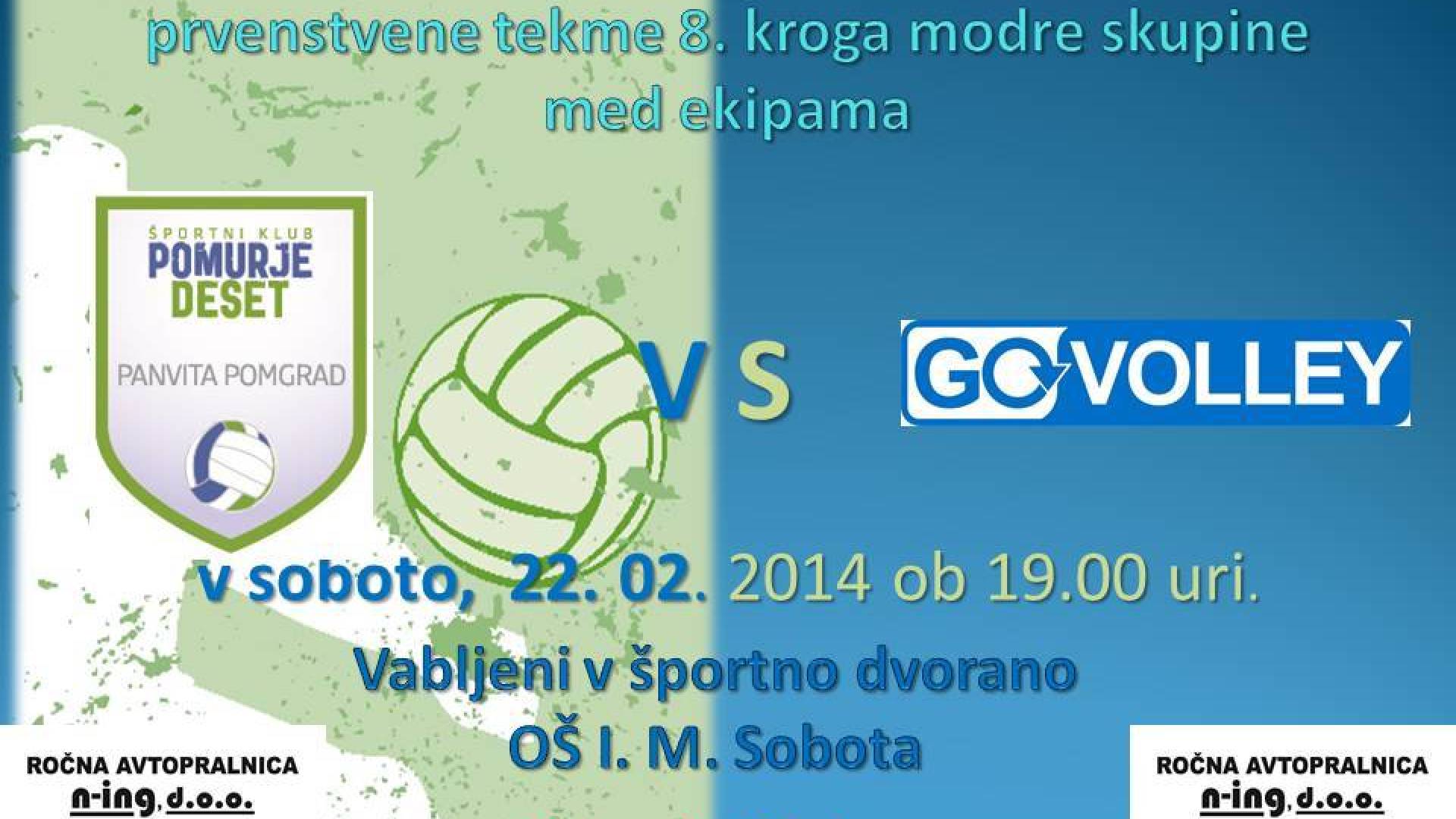 Športna dvorana OŠ I. M. SobotaLjubitelji in ljubiteljice odbojke, pozor! Modra skupina se preveša v sklepno fazo in soboški odbojkarji so blizu 2. mestu. V soboto, 22. februarja ob 19. uri jih čaka nova pomembna tekma, saj v Mursko Soboto prihaja novogoriški GO Volley. Pomembna bo tudi vaša podpora s tribun, vsako grlo bo štelo in vi lahko popeljete Panvito Pomgrad do zmage!
