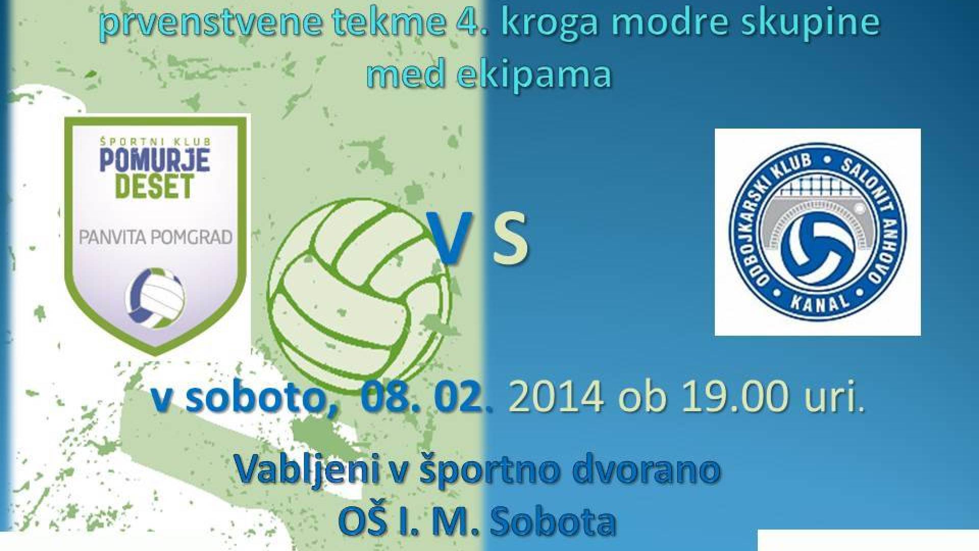 Športna dvorana OŠ I. M. SobotaLjubitelji in ljubiteljice odbojke, pozor! V Murski Soboti se v soboto, 08.02.2014 ob 19. uri obeta nov odbojkarski spektakel, kajti v goste prihaja Salonit Anhovo, novopečeni pokalni prvak Slovenije. Odbojkarji Panvite Pomgrad z njimi bijejo boj za 2. mesto, zato je ta obračun še toliko pomembnejši. Dragi navijači, podprite Panvito Pomgrad z glasnim navijanjem, soboški odbojkarji vas ne bodo razočarali.