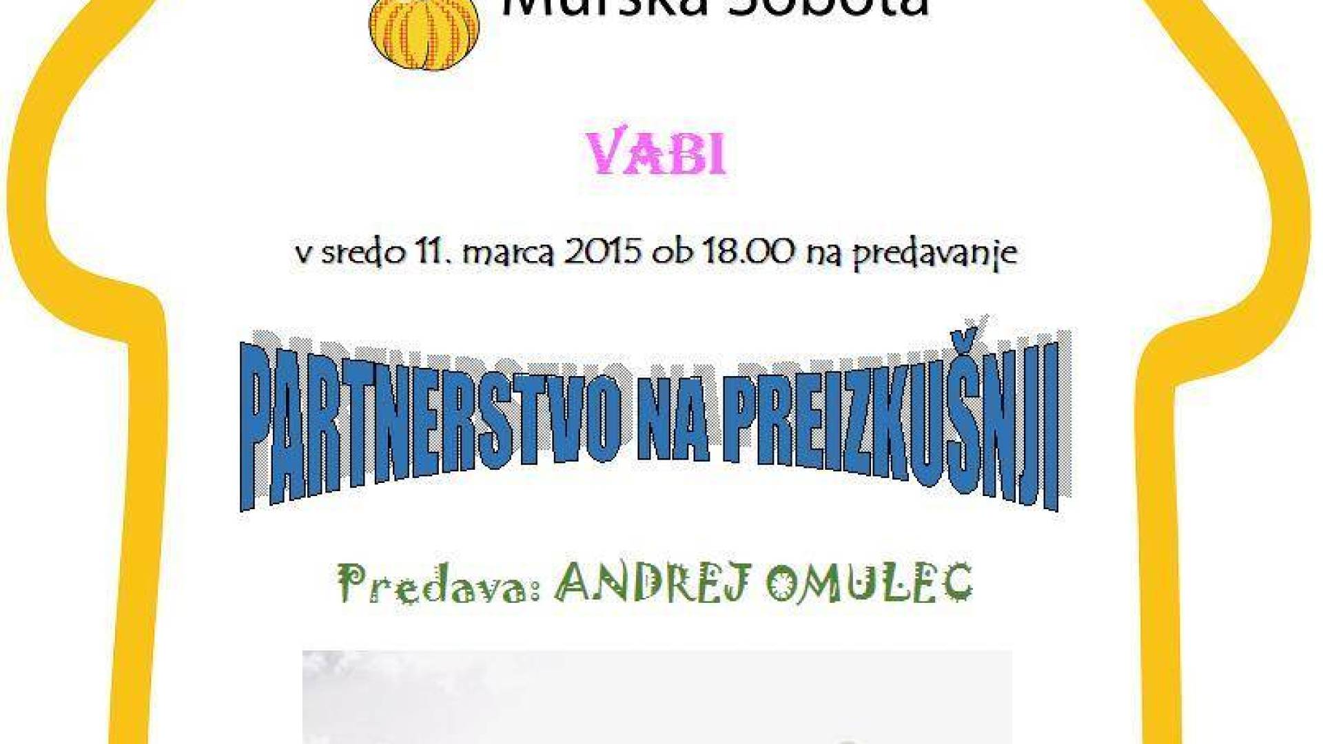 PARTNERSTVO NA PREIZKUŠNJI Hiša Sadeži družbe MS | 6. marec 2015 17:37 v Termin Sreda, 11. marec 2015 18:00 Lokacija Hiša Sadeži družbe v M. Soboti - ul. Štefana Kovača 20 Predavanje z Andrejem Omulcem.