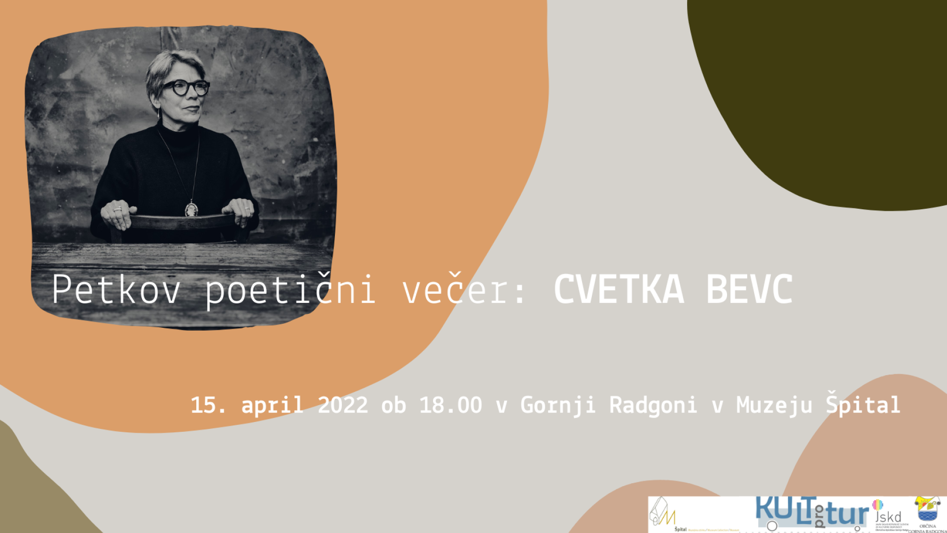 Muzej Špital v Gornji RadgoniZ uveljavljeno pisateljico, pesnico, scenaristko, glasbenico Cvetko Bevc, ki živi in dela v Murski Soboti, bo Nika Škof v petek, 15. 4. 2022, ob 18.00 v prostorih Muzeja Špital v Gornji Radgoni, govorila o poeziji in njeni vlogi v svetu, ki je usmerjen k storilnosti. O poeziji, ki vabi k čustvovanju ter opozarja na človeške zgodbe.