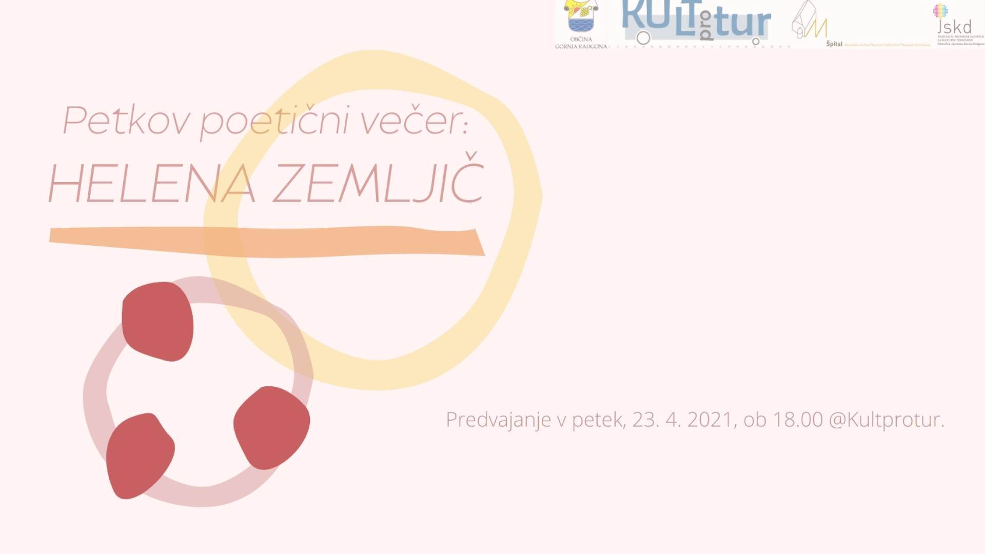 Spletni dogodek/ FB KultproturHelena Zemljič se je letos že tretjič uvrstila med dvajseterico Pesniškega turnirja. Redno objavlja poezijo in urednikuje. Leta 2016 je v soavtorstvu z Alešem Jelenkom in Nino Jančič izdala pesniško zbirko z družbeno kritičnim karakterjem Kontejner. Trenutno pripravlja svojo prvo samostojno zbirko in vse bolj posvaja intimno poetiko.