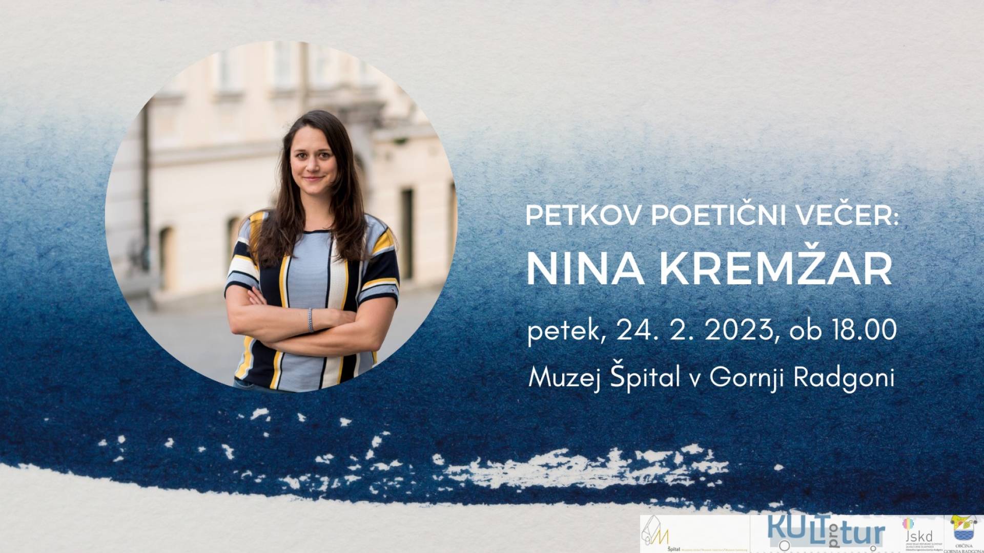 Muzej Špital v Gornji RadgoniZ Nino Kremžar se bomo podali na odprto morje, kjer smo na milost in nemilost prepuščeni temeljnim bivanjskim vprašanjem, kolektivnim zgodbam in osebnim spominom. Nina vešče zarisuje brezčasnost skozi sodobno modernistično poezijo. Lovi izmuzljivo stalnost minevanja in niza odtise brezsnovnega, ki ostaja minevanju navkljub. Ali prav zaradi tega. Vabi nas na odprto morje, v brezkompromisno plovbo med tam, takrat in tukaj, zdaj. Med nikoli in zmeraj. Med nekoč in slej ko prej.