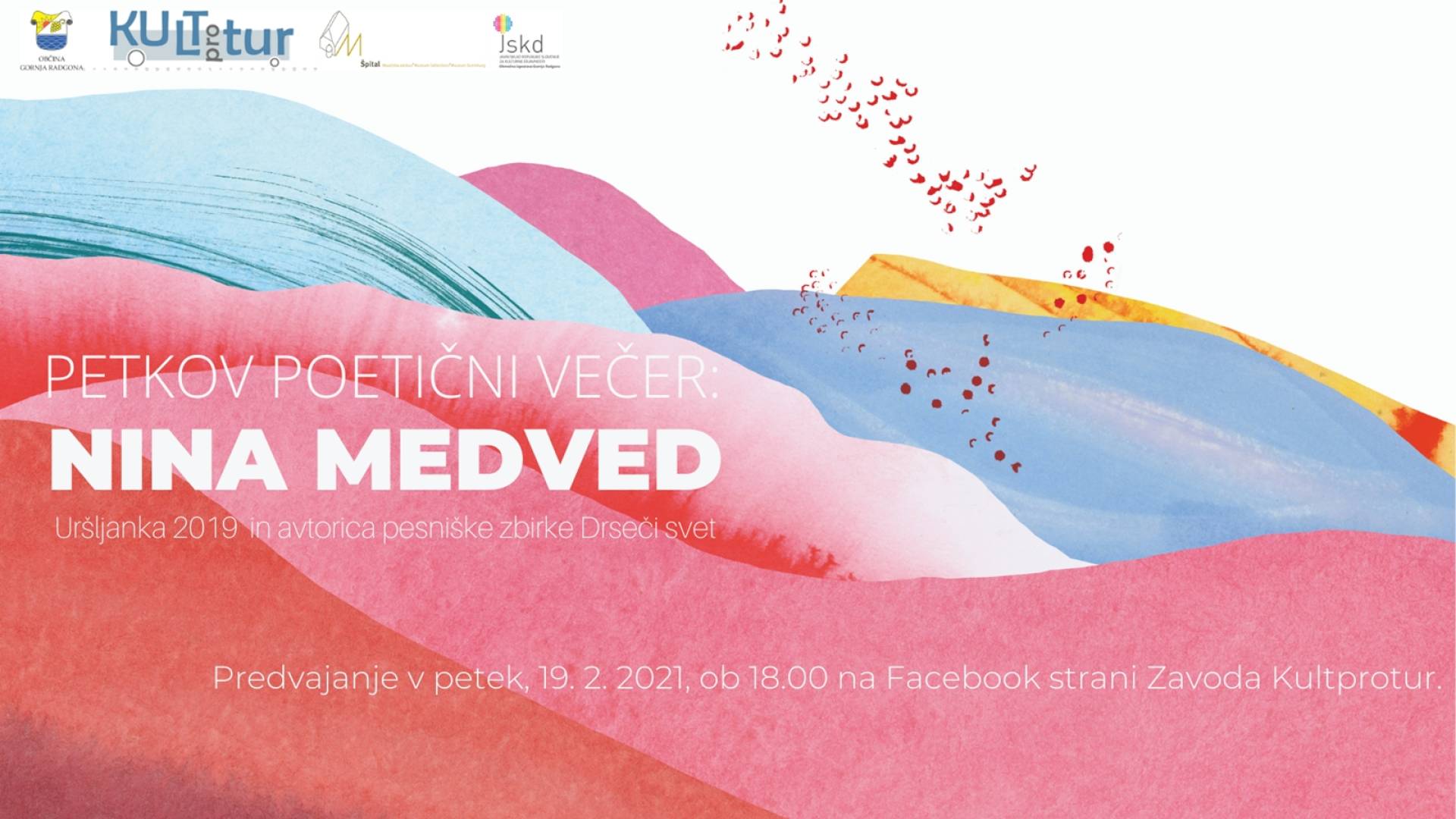 Spletni dogodek/ FB KultproturV času, ko se zdi, da svet drsi in si v njem prizadevamo najti trdne oporne točke, smo k pogovoru o poeziji, ustvarjanju in raziskovanju številnih podob povabili mlado Mariborčanko Nino Medved, Uršljanko 2019 in avtorico pesniške zbirke Drseči svet (2019).