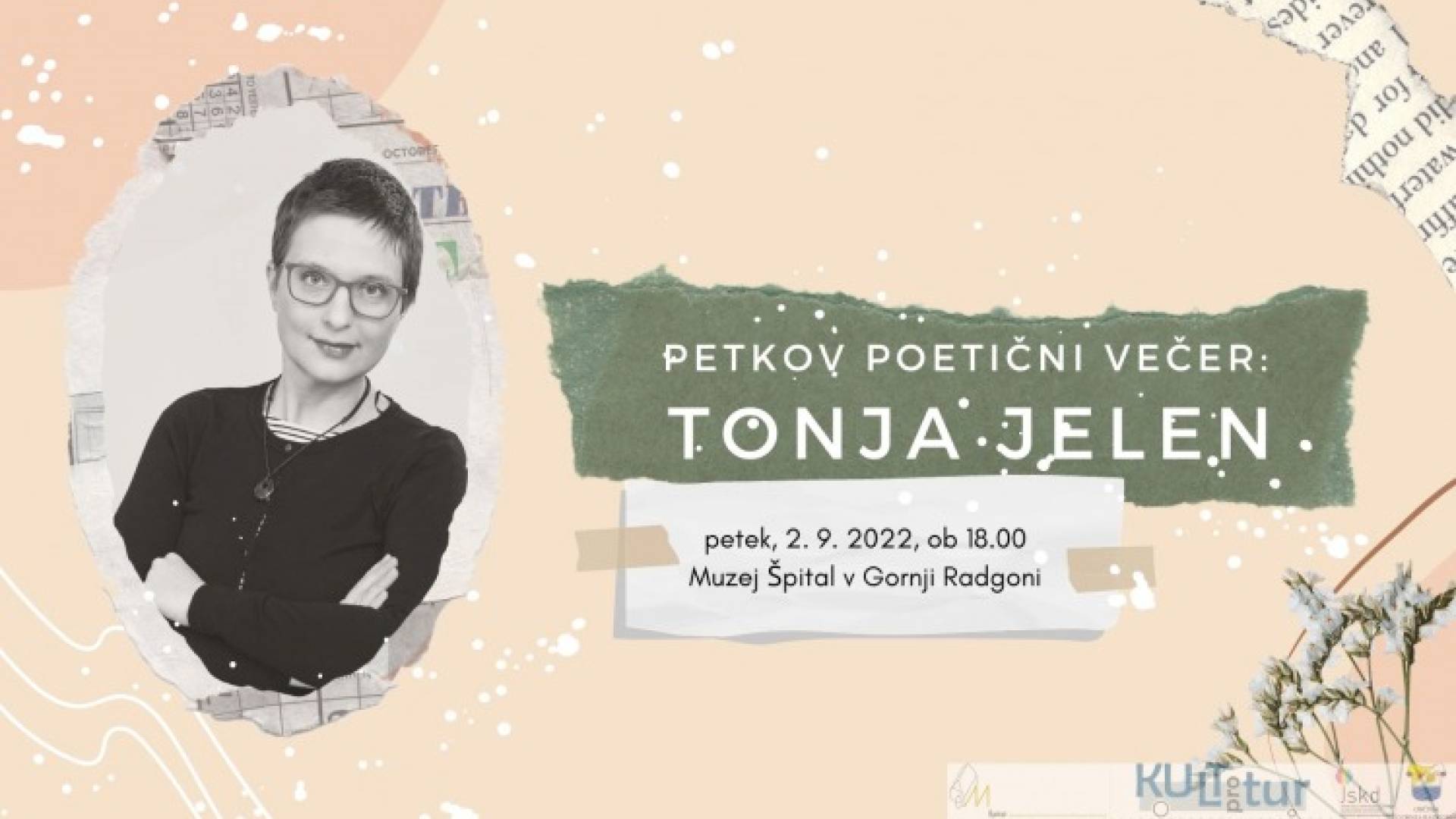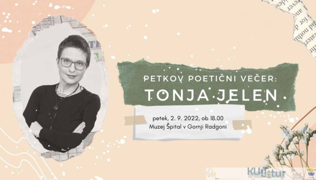 Muzej Špital v Gornji RadgoniTonja Jelen je tokratna gostja Petkovega poetičnega večera, ki bo 2. 9. ob 18.00 ustaljeno potekal v prostorih Muzeja Špital v Gornji Radgoni.