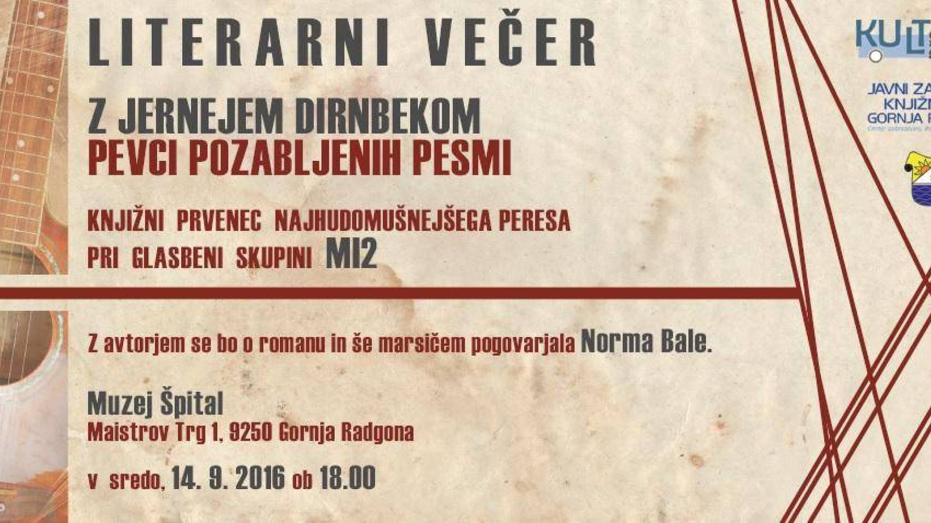 Muzej Špital v Gornji RadgoniV sredo, 14. septembra 2016, bo ob 18. uri v radgonskem muzeju Špital predstavitev literarnega prvenca Jerneja Dirnbeka, najhudomušnejšega peresa pri glasbeni skupini MI2. Z avtorjem se bo o njegovem romanu Pevci pozabljenih pesmi in še o marsičem pogovarjala Norma Bale.
