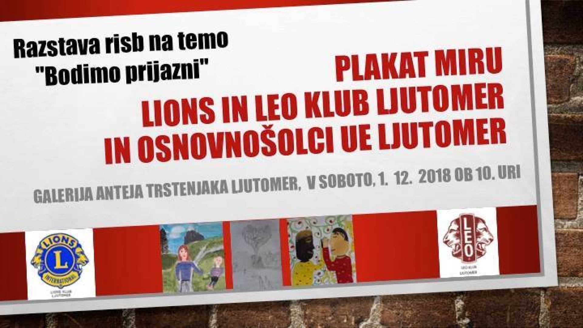 Galerija Ante Trstenjaka Ljutomer - Dom kulture LjutomerPred nami je otvoritev razstave Plakat miru, ki bo v soboto, 1. decembra, ob 10. uri, v Galeriji Anteja Trstenjaka v Ljutomeru. Letošnja tema nosi naslov "Bodimo prijazni". Spet so ustvarjali osnovnošolci UE Ljutomer.