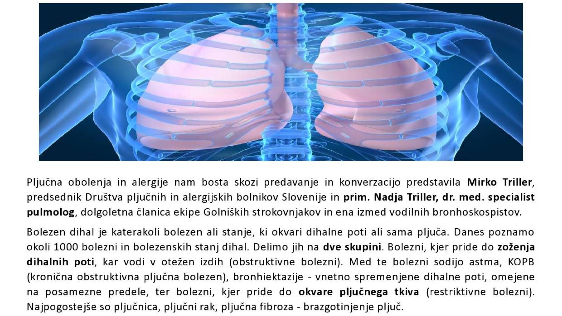Pljučna obolenja in alergije nam bosta skozi predavanje in konverzacijo predstavila Mirko Triller, predsednik Društva pljučnih in alergijskih bolnikov Slovenije in prim. Nadja Triller, dr. med. specialist pulmolog, dolgoletna članica ekipe Golniških strokovnjakov in ena izmed vodilnih bronhoskospistov.