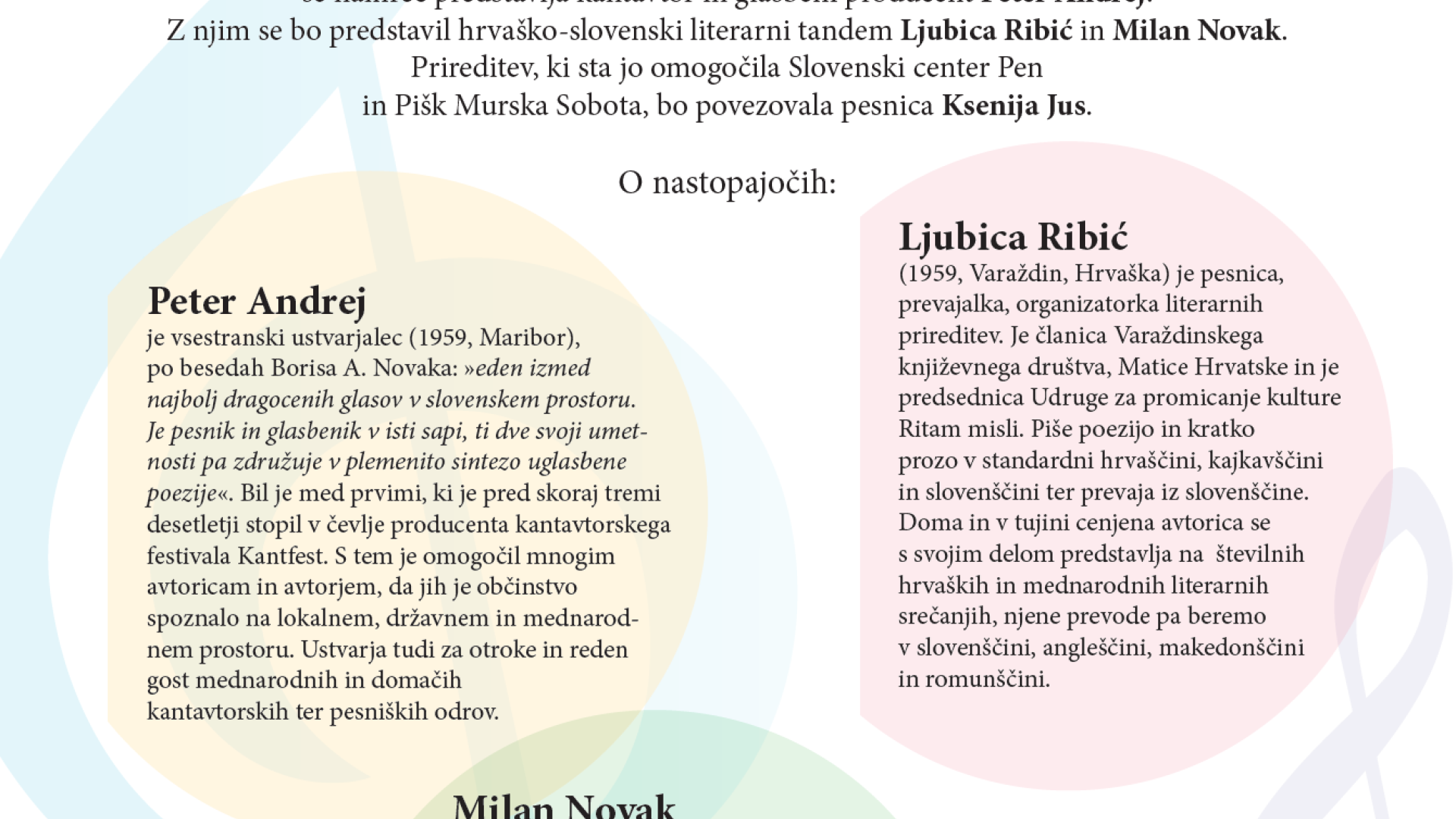 Pokrajinska in študijska knjižnica Murska SobotaPrekmurskemu bralnemu avditoriju se predstavlja kantavtor in glasbeni producent Peter Andrej. Z njim se bo predstavil hrvaško-slovenski literarni tandem Ljubica Ribić in Milan Novak. Prireditev, ki sta jo omogočila Slovenski center Pen in Pišk Murska Sobota, bo povezovala pesnica Ksenija Jus.